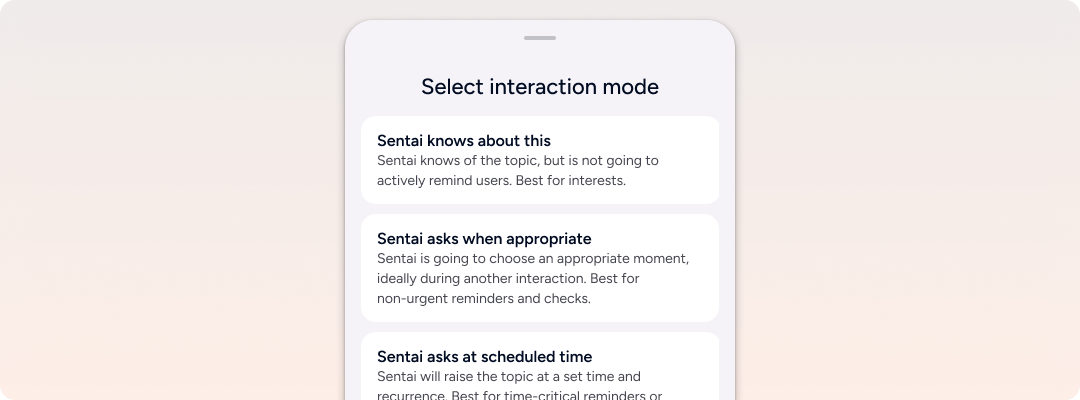 Sentai offers a number of options to schedule an interaction. By default, unless a reminder is time critical, we recommend using “Sentai asks when appropriate”. This reduces the number of interactions as Sentai will group conversations when possible.