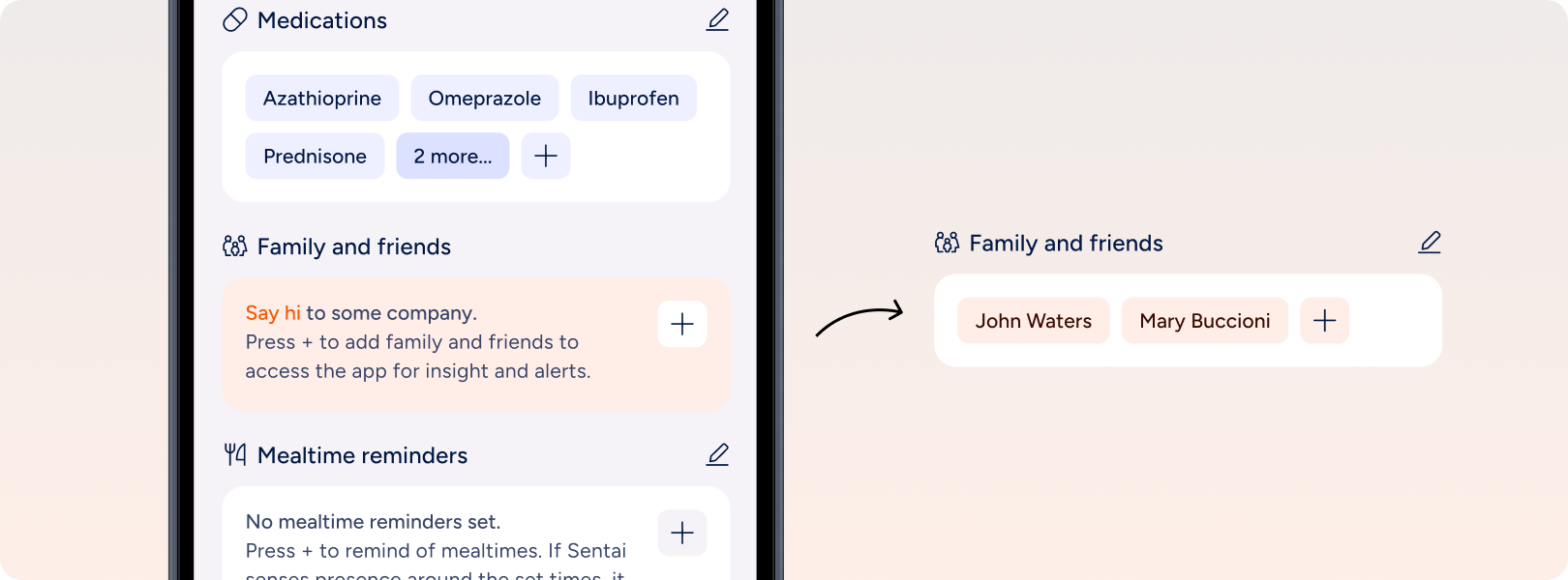 Sentai enables you to spread the load of daily care by building a support network that can receive alerts, requests, and daily insight. You can extend the circle of care by setting up family and friends and give each member a specific role.