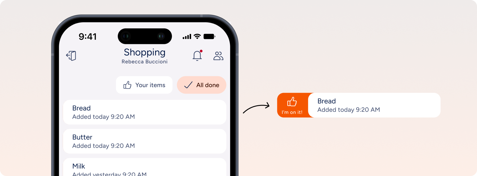 Tap “I’m on it!” and, once you’ve taken care of the item, “Done”, to let everyone know you have taken care of it.